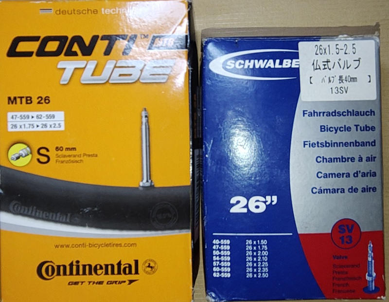左のコンチネンタルのチューブは右のシュワルベに比べて対応サイズが少ないうえにデカくてかさばるチューブです。右は先日購入したチューブに似ていますが、対応する最大タイヤサイズがわずかに太い(26×2.5)旧製品です。両製品とも少し古い物になりますが、右のシュワルベはCLIK VALVE装着確認できました。コンチネンタルはバルブコアが外せないのでアウトです。もちろん現行のシュワルベチューブもOKでした。