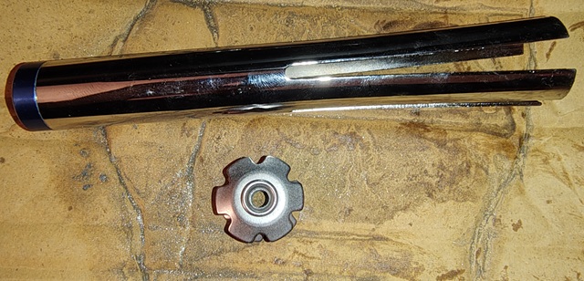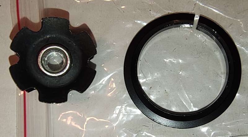 フレームから自転車を組んだことはあるのでヘッドパーツのインストールは経験済みです。しかし、古いヘッドパーツを外すのは今回が初めてです。と言うわけで、ヘッドパーツ抜くために特殊工具をアリエクで調達しました。ただ、これ細すぎな気がします。サイズ比較用にスターファングルナットを並べて撮影しました。なんかサイズ的に思っていたのと違う…こう、広がったタコ足がヘッドパーツ内側円周にまんべんなく引っかかる感じを想定していました。実際にはタコ足の一部しかかかりません。