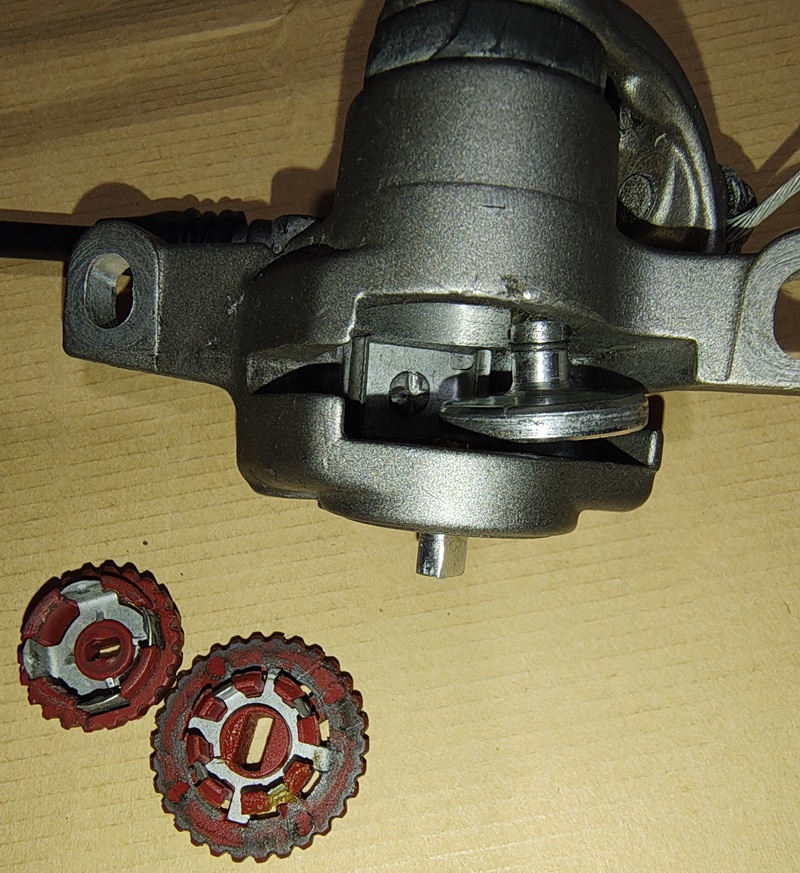 と言うわけで、分解は稼働ピストン側中心に行っていきます。ある程度ばらしたところで内周にスプラインが入っており、特殊工具が無いと無理な感じなので分解は断念しました。とりあえず分かったことは、パッドに接触している第2ピストンが外れている感じです。なぜか稼働側ピストンが2段構成になっており、稼働ピストンが直接パッドを押す形にはなっていませんでした。パッドの接触を均一にするための細工がしてあるっぽい?