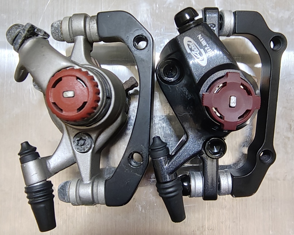で、早速取り付けたわけですが、ここでもトラブル発生です。ブレーキを思いっきり引くとキャリパー側のアームが戻りません。ワイヤリングを疑い、キャリパー単品でアームを動かしても再現します。この製品は前後共通キャリパーなので同じものを2つ使うわけですが、アームの戻らない不具合が出ているのは一つだけなので、これは扱い方を間違っているわけではなく、キャリパー側の不具合の可能性が濃厚です。