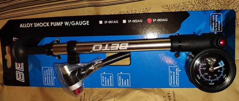 エアサス用のポンプ未所持でした。バルブ自体は米式の形なのですが、普通のポンプ類では空気が入りません。と言うわけで専用ポンプを調達。amazonで¥3,280です。結構懐に響く金額だぞ… これが無いとエア圧が調節できないので仕方なし。