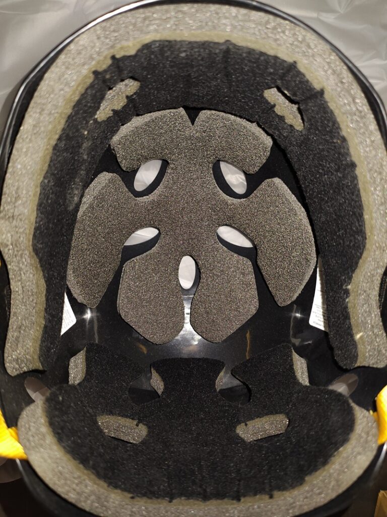 2層スポンジ張り付けているだけですね。実際にかぶって頭を叩いてみると、これはマズいな…といった感想しか出てきません。と言うわけで買い替え決定。