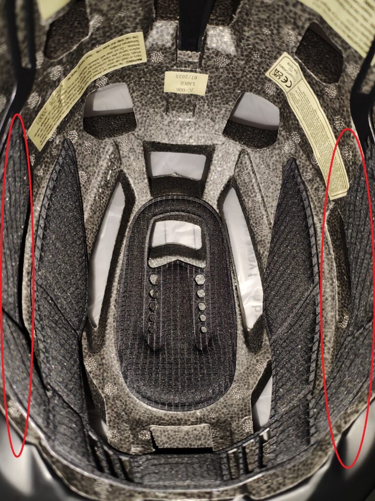 着脱式内装のこめかみにあたる部分をハサミでカットしました。まぁまぁ悪くない感じになったのでOK。前後長さは調整ダイヤルで締められるので問題無し。