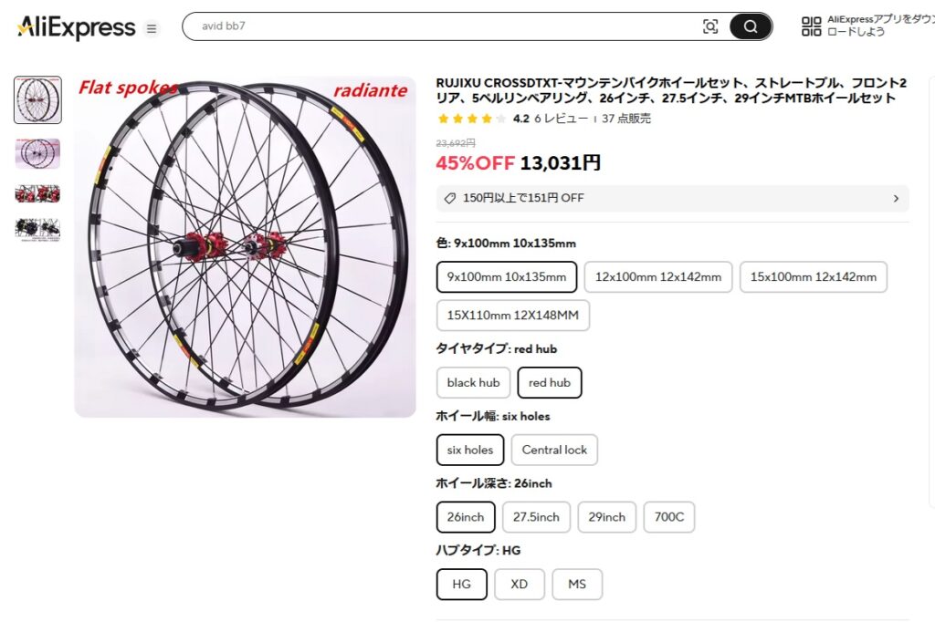 ついでなので予備ホイールのお話をします。現在装着しているのがMavicのCROSS RIDE DISC26インチです。偏平ブレードスポークのかっこよさに惹かれて買ったものです。たぶんMavicで一番安い部類です。そしてスパイクタイヤで雪道走行用に前輪Araya TM840Fと後輪Mavic XM117のディスク・リムブレーキ両用のボロボロになっているホイールを所持しています。もう1セットくらいホイールあってもいいかな?と考え、アリエクでホイールを注文しました。