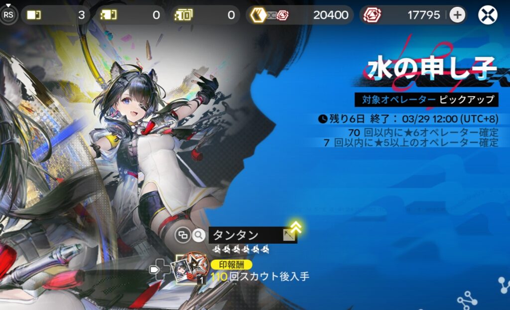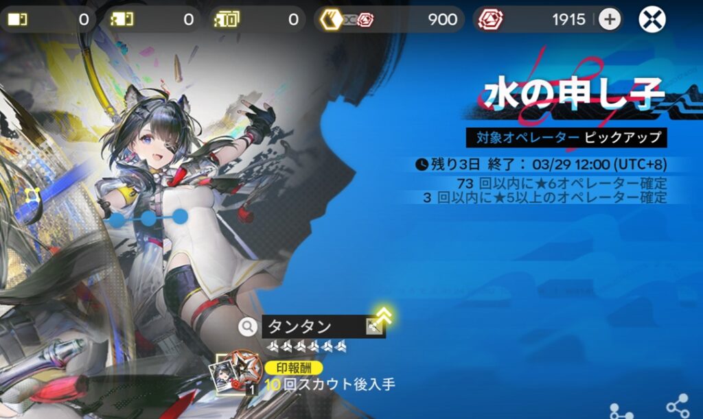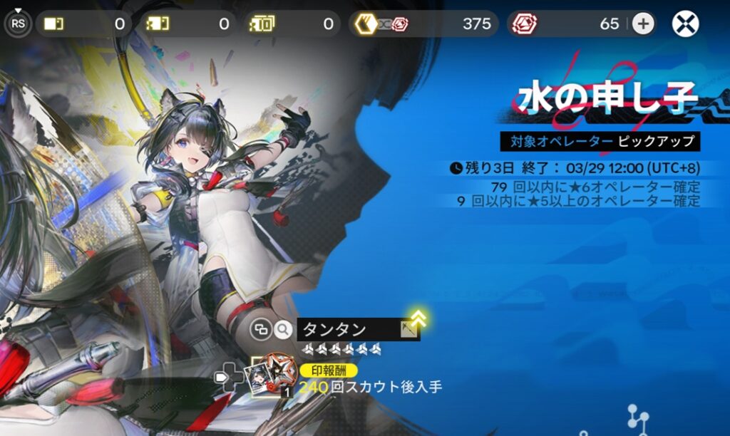 確定報酬のカウントが10連進んだわけですが、10連する前の画像と比較すると、ガチャ石が壊滅的になっているかわりに奇跡が起きているのがわかります。「71回以内に★6オペレーター確定」だったのが「73回以内に★6オペレーター確定」になっていますね。そうです、タンタンを引いた次の10連でまた★6が排出。タンタン2凸になりました。